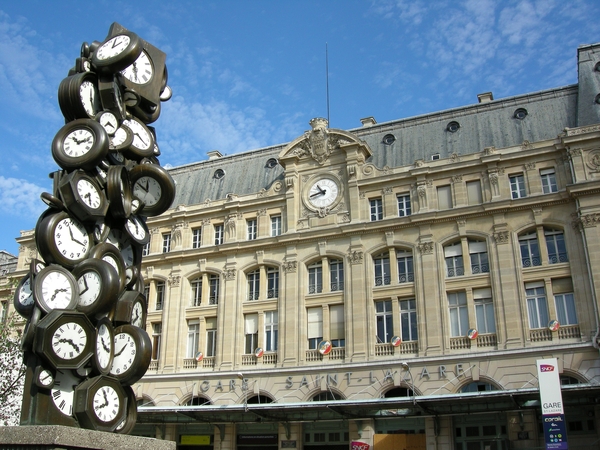Opera外表部分正在整修,但不掩其金碧輝煌。拉法葉百貨就在Opera後方,但我們為了找郵局寄明信片在附近繞了好一會。好不容易找到一家,無奈的卻沒開,一直逛到聖拉薩車站附近才找到另外一家,不過也因為這個意外我們才得以見到“所有時刻”這雕像。這是科芒1885年的作品,鄰近的咖啡館也取這意趣,店內的椅背上都是一個大時鐘。不過車站外面也在整修,所以不是很美觀。巴黎似乎處處都在整修中。