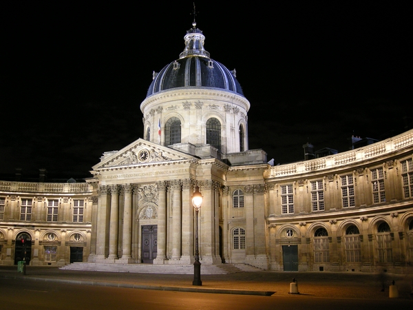 由於謙和隔天就要去瑞士還沒喝過左岸咖啡(他從下午就一直想哄騙我們去找左岸咖啡),因此央求凌雲帶我們去找左岸咖啡。雖說是左岸咖啡,但比較有名的都離左岸有點距離,我們去看了巴黎最老咖啡店,自1686年就開始營業了。雙偶(Cafe Aux Deux Mogots)裡面則是一堆老頭,巴黎人選咖啡館還得看消費群,我們這些年輕人顯然不太能融入這些白髮蒼蒼的客人間。花神倒是沒看到(Cafe de Flore)。最後我們什麼咖啡也沒喝,走去塞納河上看夜景。最後一班的遊船剛靠岸,走下一群衣裝華麗的年輕人,藝術散步橋(Passerelle des Arts)滿是跟我們一樣野餐、欣賞夜景的閒人。我也幫法蘭西學院照了幾張相。