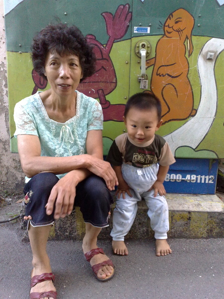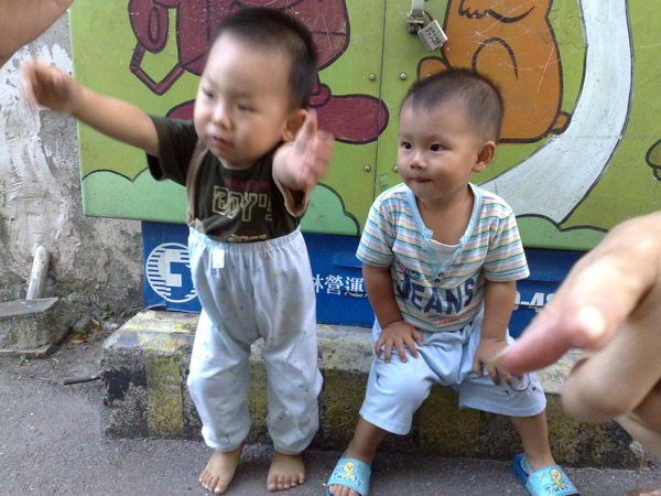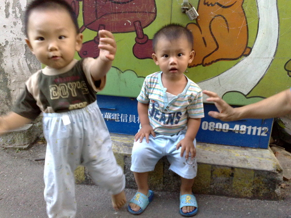 稍後二伯母也把俊凱帶出來走走,俊凱大了塏育約3個月,但已經會說一些簡單的字彙,站得也比較穩,不過也比較調皮。由於是在馬路上玩,所以經常有車子經過,當車子來的時候,塏育會衝去抱住大伯母,俊凱則是追著車子跑,害我得趕緊去把他抓回來。