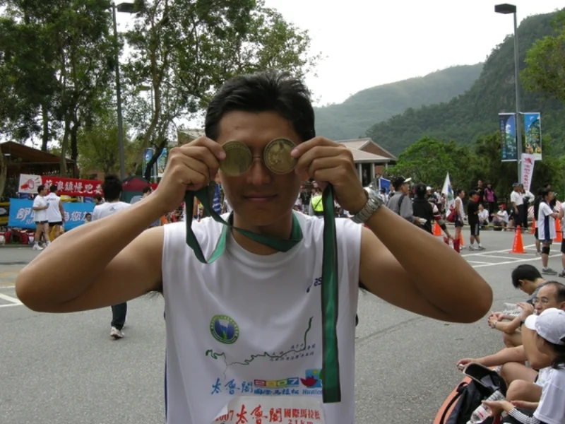 下坡體力的負擔少些,但對於腳的負擔卻大增,所以整體上的速度還是差不多。還好太魯閣風景真的很漂亮,跑起來相當愉快。參加路跑的女生也蠻多的,所以除了欣賞風景還可以欣賞漂亮的女生。最後兩公里的隧道令人相當沉悶,感覺跑不完似的。我初入隧道就被馬拉松第一名選手追過去了。待我到達終點大約花了兩個半小時。拿了一個完跑證明的獎牌,相當有成就感,雖然沒有一路跑完。