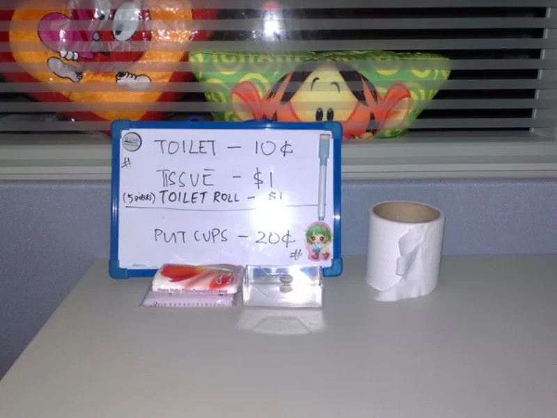 依倫很喜歡拿他的小白板搞怪,像是上圖這個衛生紙服務