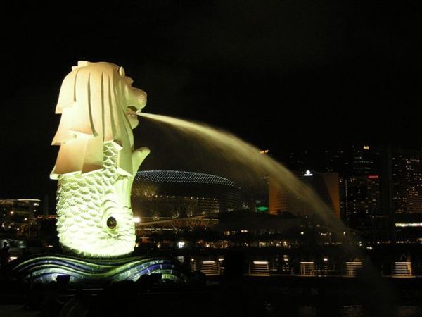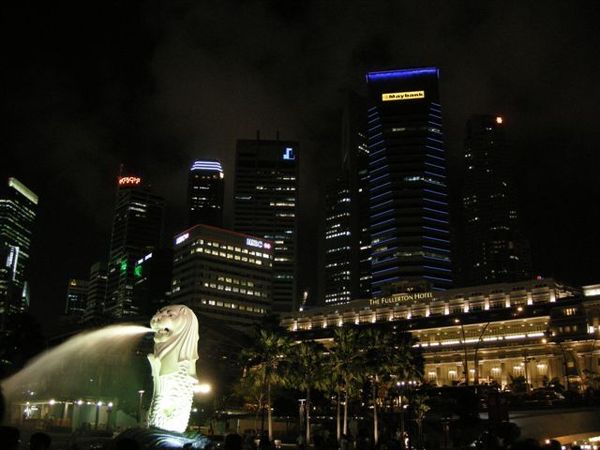 下面這是新加坡著名地標,魚尾獅。晚上看比較漂亮,背後是大榴槤。