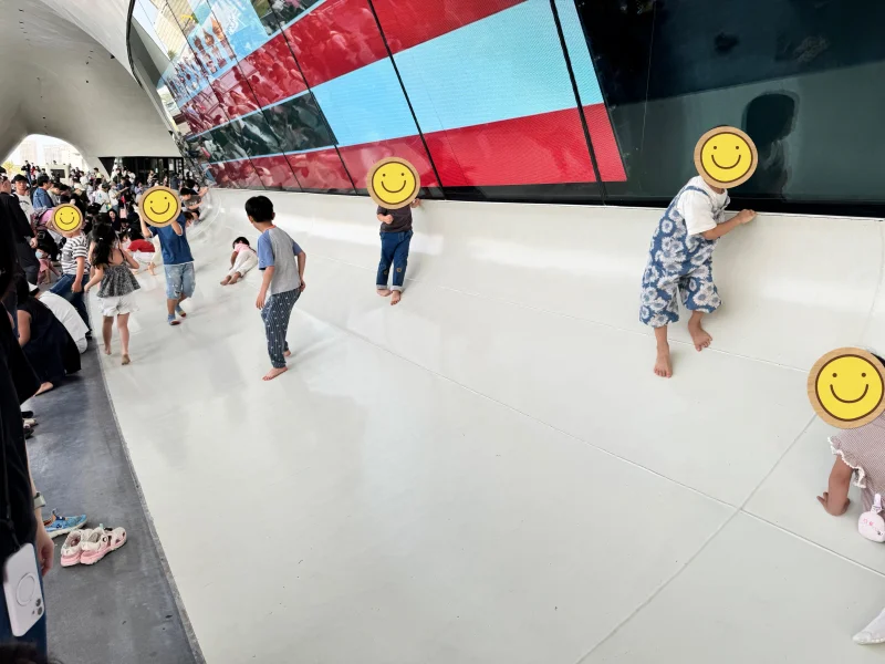 We were originally going to take a quick look at the main building of the National Kaohsiung Center for the Arts and leave (too crowded, and we were very thirsty), but our daughter spotted children on a slide and insisted on going down to play. Our friend’s child immediately joined in. When it was finally time to leave, our daughter was surprisingly agreeable, but our friend’s child refused to budge and had to be forcibly carried away by her dad—like trying to hold onto a wriggling fish.