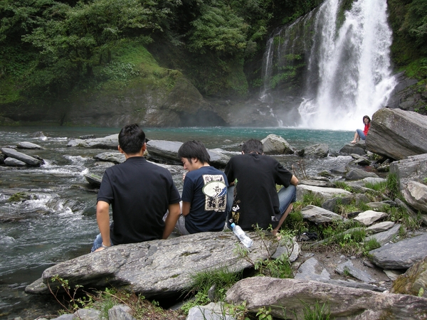 中午的行程是三疊瀑布。路牌上指示來回要三小時,而且王彥鈞在網路上看到有女生說走到會哭,所以只有彥鈞、188及我去探險,留楊昇儒及其女友逛其他地方。往三疊瀑布的路一路下坡,年輕人的熱血心性使我們不停歇的趕到瀑布。潭水碧藍,瀑布稱不上壯觀但卻令人心神愉快,可以坐在岸邊觀賞一整個下午。水相當的冰冷,我們三人脫了鞋在大石上泡腳。可能是因為我們過於輕裝,一旁其他遊客相當熱情的分我們水喝還請我們吃麻糬。23歲了,其實與18歲時並沒有太大的差異。