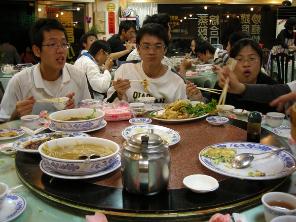 上一次風城盃我急著回台北,沒吃到慶功宴,這次索性就留到最後,跟大家一起去狂歡。這次選的店是龍昌小館,以巨大的蒸餃著名。一行二十人分兩桌,我這桌除了我自己以外全都是"年輕人"。大家食慾相當好,沒盛飯狂點菜,每道菜一上桌都是狂搶,搶到工作人員側目。途中茶水一旦沒了,大家就會互相推拖,不是因為大家懶,而是深怕一離開座位菜一上桌就吃不到了,有一次我心想吃得差不多了,去裝填茶水好了,沒想到端菜的阿姨急急忙忙的說"我幫你裝啦!不然你會少吃一道菜!"。