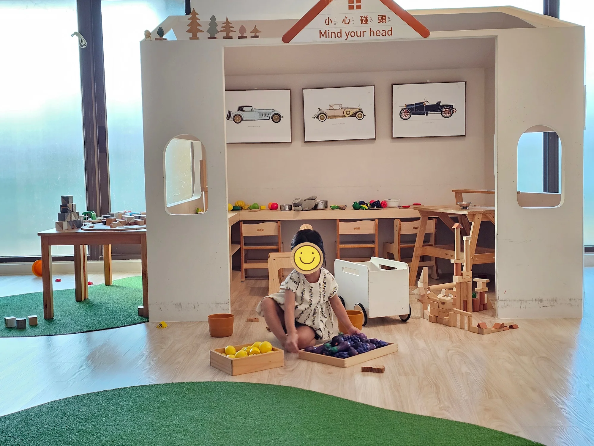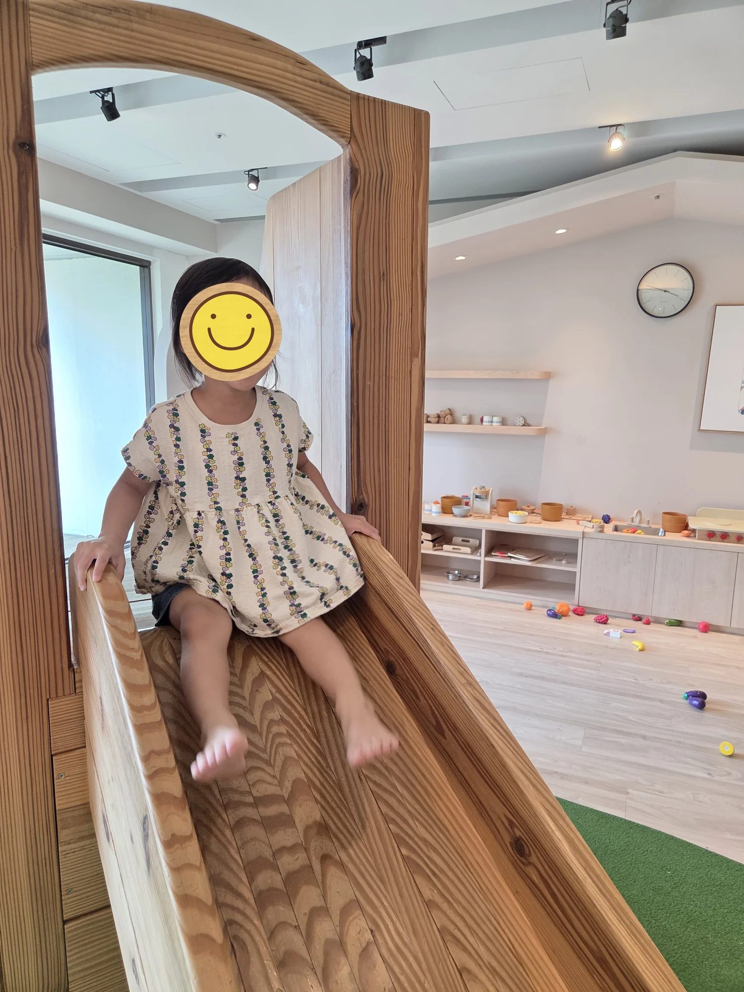 女兒對二樓的親子童玩間比較感興趣。這是一個很寬敞的親子空間,明亮、整潔、相當舒適。有木製溜滑梯、鐵製鞦韆,還有許多家家酒的木頭道具,還有一塊區域是童書空間。