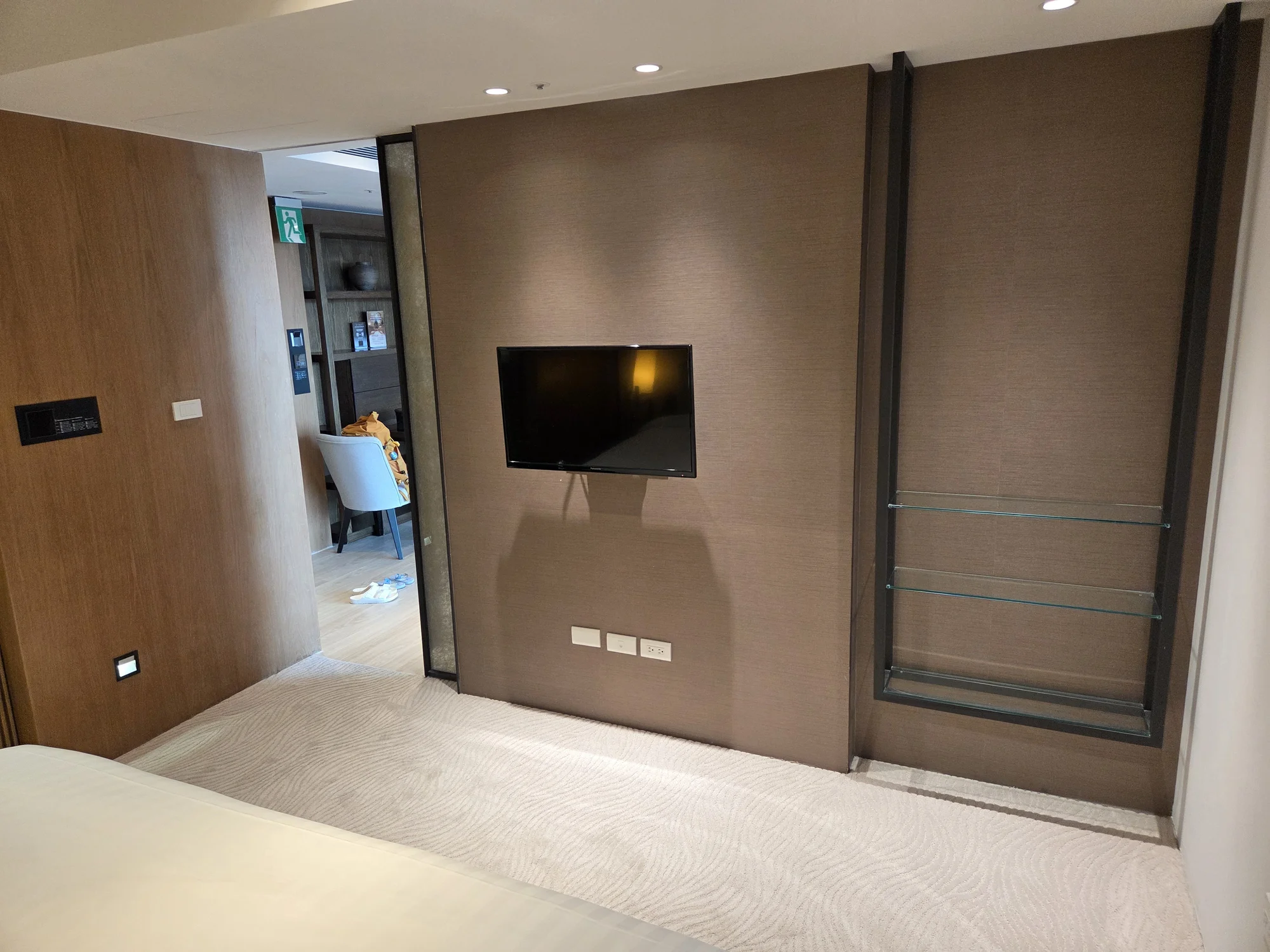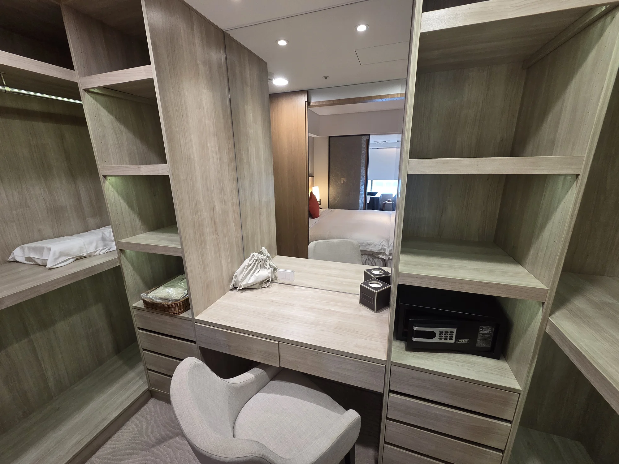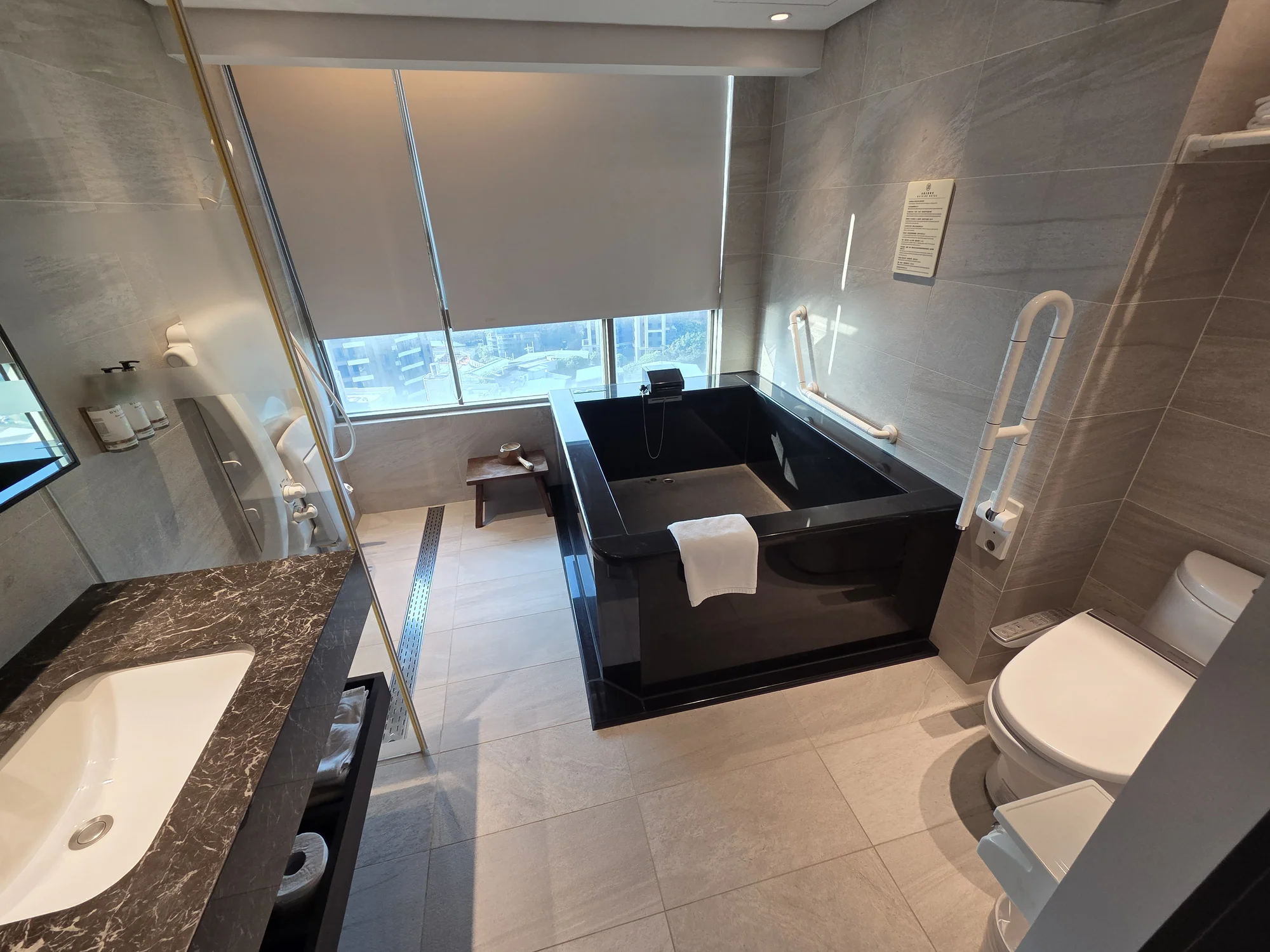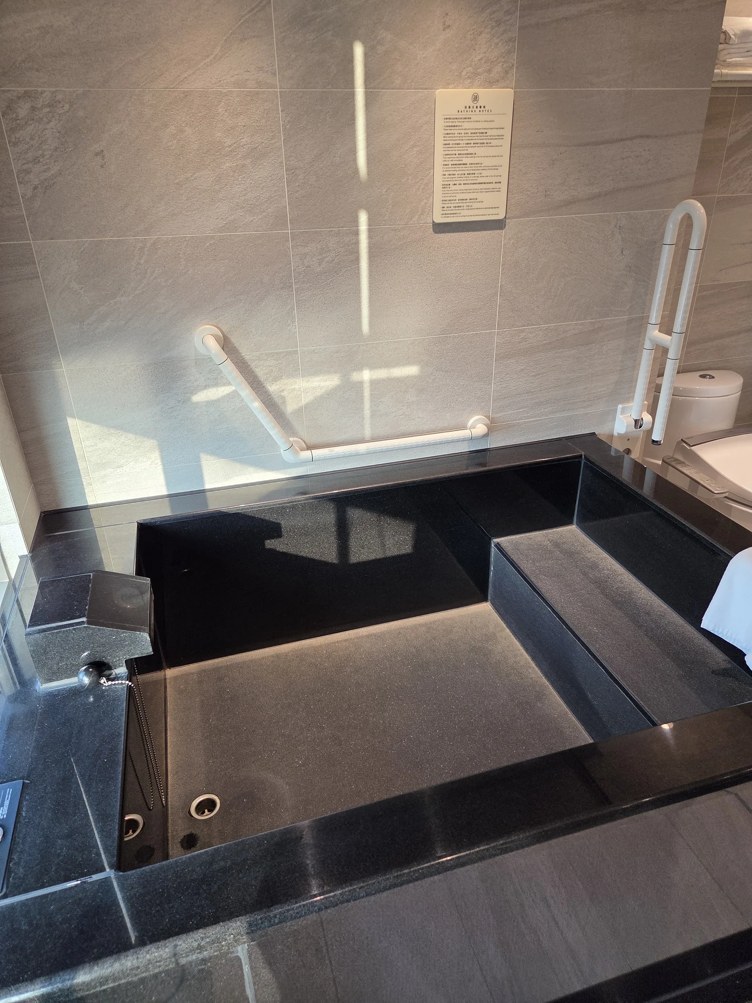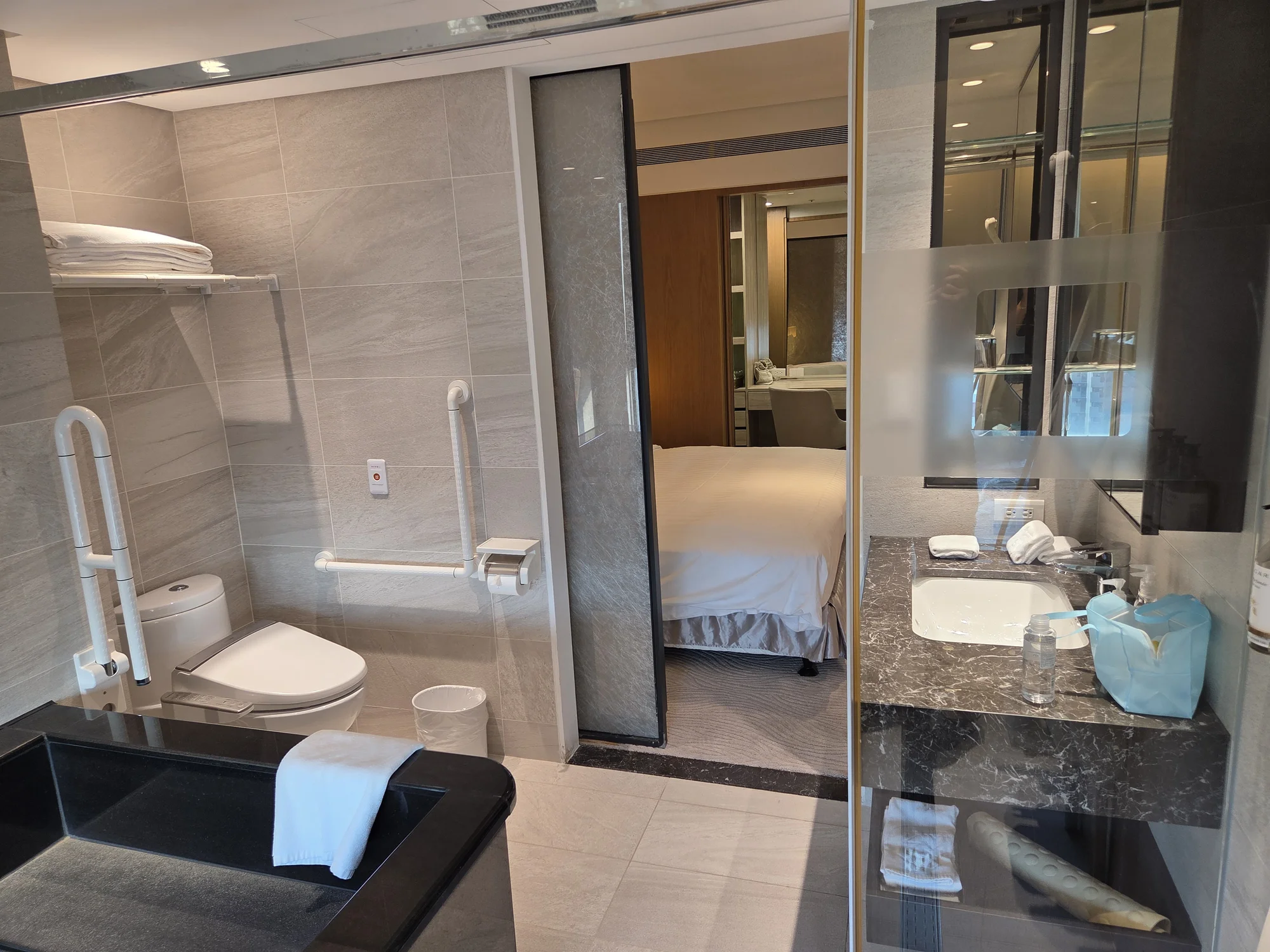 陽台十分寬敞,很適合晚上搬張露營椅在這邊小酌,不過顯然不能喝太醉。臥室有一個步入式衣櫃,來玩的人真的用得到這麼多收納空間嗎?浴室有一個看起來像是養護浴座的東西,而且浴室入口採平整設計,看起來是專門設計的無障礙浴廁。