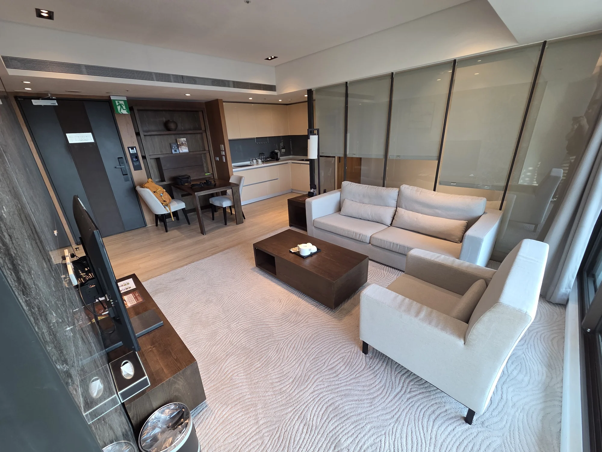 房間內多數的裝置都可以透過沙發旁邊的智慧型螢幕控制,像是窗簾、燈光、冷氣,也可以透過語音控制。